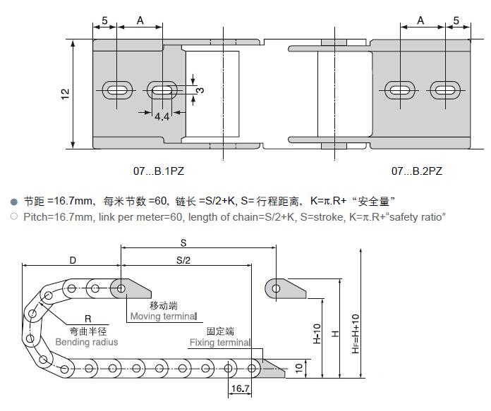 1)內(nèi)高:選擇內(nèi)置電纜、油管、氣管、水管等中最粗的一根作為參考高度,加上至少10%的高度空間作為拖鏈內(nèi)高,如果重疊按重疊后實際高度作為參考高度。
