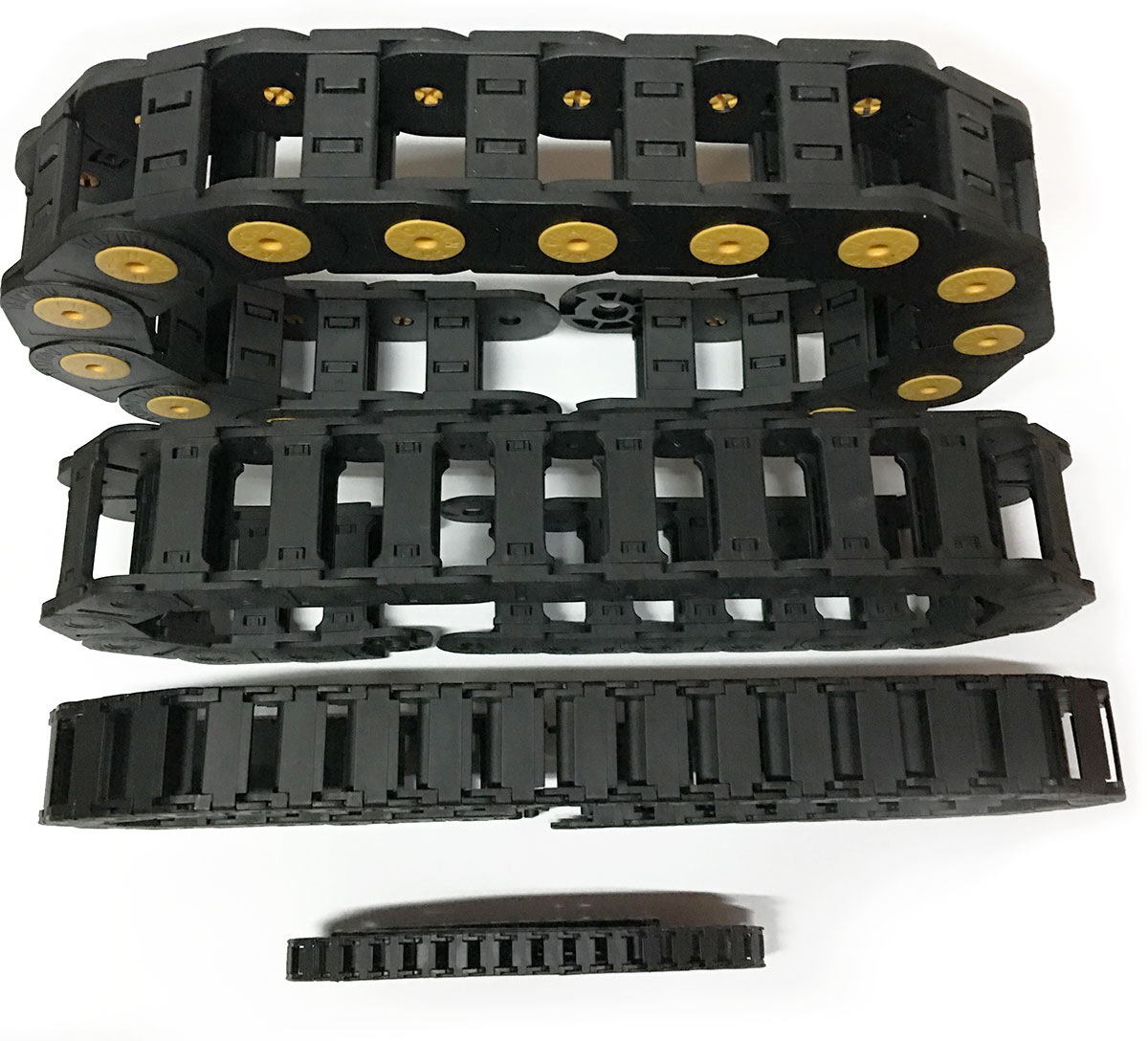 按形式可分為:橋式拖鏈、多聯橋式拖鏈、封閉拖鏈、消音拖鏈、開口拖鏈、萬向拖鏈、坦克鏈、穿線拖鏈等。按使用環境的條件要求:需防油、防水、防垃圾污染、耐高溫、耐摩擦、需要加長、需要承重、無噪音、將線纜隱蔽等。三種裝配形式:橋式拖鏈、全封閉式拖鏈、半封閉式拖鏈。