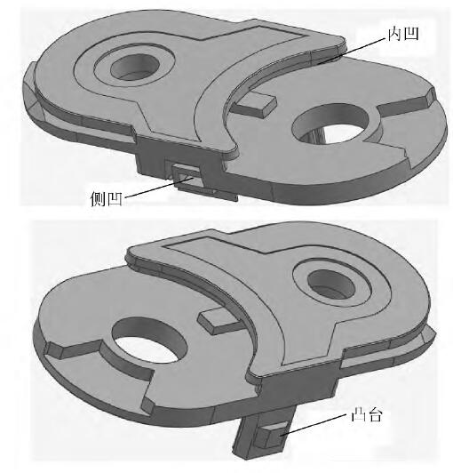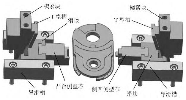 抽芯機構的設計為了使注塑工件順利脫模需設計抽芯機構,抽芯機構由楔緊塊、滑塊、側型芯、導滑槽和限位螺釘等組成,如圖3 所示。凸臺和側凹的抽芯設計為動模抽芯,其抽芯力及抽芯距均很小; 楔緊塊采用螺釘固定在定模板上,與滑塊采用T 型槽連接,開模后楔緊塊和滑塊相對運動促使滑塊帶動側型芯沿著導滑槽移動,實現了凸臺側型芯和側凹側型芯與塑件的脫離。