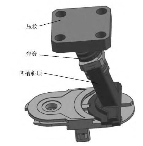 為使塑件的內凹在開模時順利脫模,設計了定模抽芯機構,該機構由壓板、彈簧和凹槽斜頂等組成,如圖4 所示。開模時,一直處于壓縮狀態的彈簧松開,產生的彈力使得凹槽斜頂向外側運動,直到凹槽斜頂和工件脫離,實現定模凹槽斜頂的脫模。