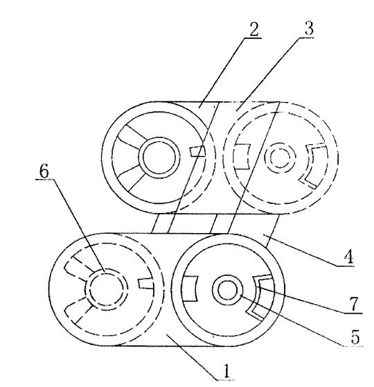 [0010]如圖所示,本實用新型由若干工程塑料制成的鏈節相互鉸連接組成,相鄰的鏈節之間設置封閉板80Fool 1 ]各鏈節主要由兩片相對設置、呈倒腰鼓形的板體1,2組成,兩片板體之間上、下面分別設置上、下接緊片3,4。