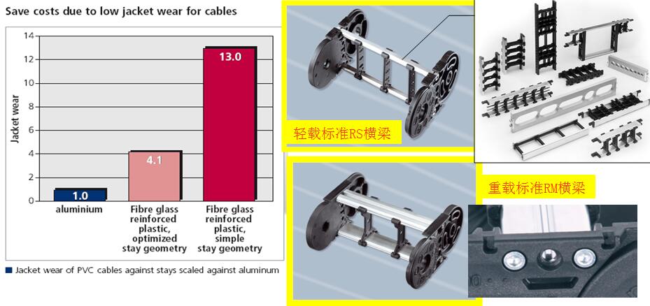 注:可選鋁橫梁和不同幾何結構的橫梁;為何德國一直以來專著于橫梁設計的研究,因為通過試驗測試普通塑料橫梁對電纜造成的損耗為優化塑料橫梁的3倍,是鋁制橫梁的13倍;目前除了,很少有其他廠家對此進行深入研究