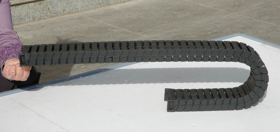 塑料拖鏈用于數控機床、加工中心、自動化機械及生產線等各類機床、機器人、運輸機械、測量儀器、搬運裝置以及其它驅動控制作為電線、電纜液、氣軟管的防護裝置,能隨機床、機械設備移動部件協調地運行,可發揮安全保護和導向的能力,可延長被保護的電線、電纜、液、氣軟管的使用壽命,降低消耗,可大大改善機床、機械設備的電線、電纜、液、氣軟管分布零亂的狀況,使之整齊、規則地排列在一起,能增強機床、機械設備的整體藝術造型效果。