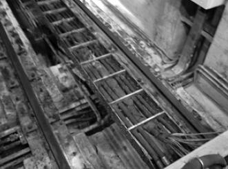 通過觀察,鋼卷運輸車的拖鏈在運行過程中中間有下垂的現象,這主要是由于鋼卷運輸車的行程較長。入口鋼卷運輸車的行程為13000mm,出口鋼卷運輸車的行程為14000mm,而在這么長的行程范圍內在設計上拖鏈完全沒有任何支撐。當鋼卷運輸車運行到遠端時,拖鏈的中間部分已經彎曲變形甚至與地面接觸,而在拖鏈上安裝的液壓軟管和電纜也同樣隨之彎曲甚至與地面摩擦,經過反復的彎折,拖鏈中的電纜芯容易疲勞斷裂,造成鋼卷運輸車故障不能正常工作。電纜線斷裂故障除了與其在隨拖鏈運動時反復彎折有關外,電纜線在拖鏈內的分布也對其有很大的影響。拖鏈一般是由單元鏈節由左右鏈板和上下蓋板組成,拖鏈每節都能打開,裝拆方便,不必穿線,打開蓋板后即可把電纜、油管、氣管、水管等放入拖鏈。而在拖鏈的內部另外可提供分隔片,將鏈內空間按需要分隔開。鋼卷運輸車的電纜線連同液壓軟管通過分隔片被固定在拖鏈內,但是液壓軟管與電纜的分布孔過于集中,安裝后電纜線比較擁擠,一些較細的電纜線甚至被卡在分隔片與鏈板間。通過分析認為,電纜線分布集中,被捆扎在一起,而且電纜線隨拖鏈反復擠壓、彎曲折損,時間一長造成電纜線疲勞斷裂。改造前電纜線和液壓軟管在拖鏈內的分布如圖1:
