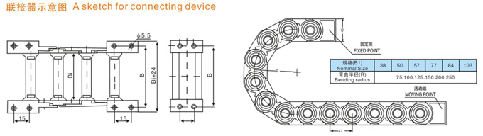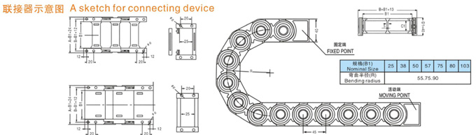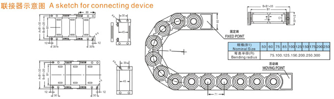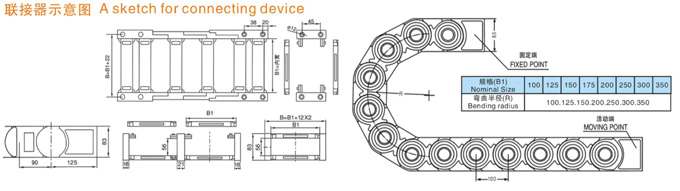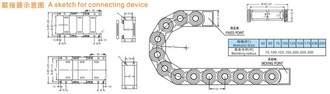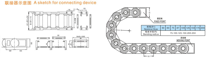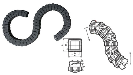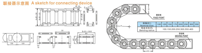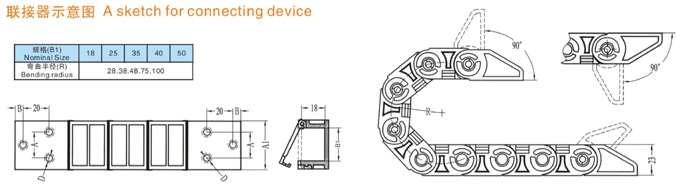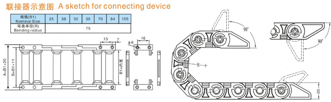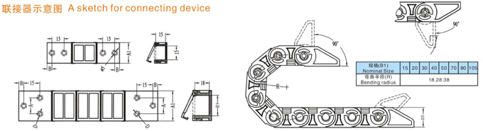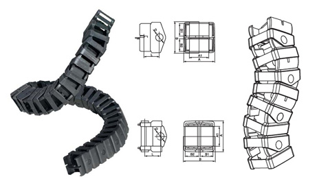 TL1型塑料拖鏈規格型號設計為組合式加強型,可任意上下開啟,安裝方便,結構合理堅固耐用.